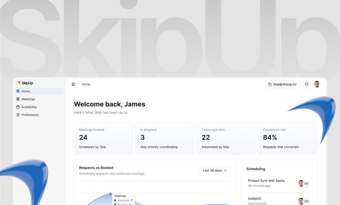 SkipUp is an AI follow-up and scheduling assistant for busy professionals. It connects to your calendar and manages the relationship from first follow-up to booked meeting.